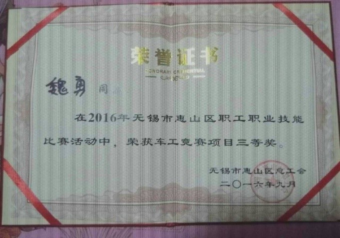 9月26日, 2016年惠山區職工職業技能大賽在惠山中等專業學校實訓基地鳴鑼開賽; 這次比賽結束獲獎的顏傳奇、魏勇在“無錫市惠山區總工會”網站上刊登表揚。如圖所示