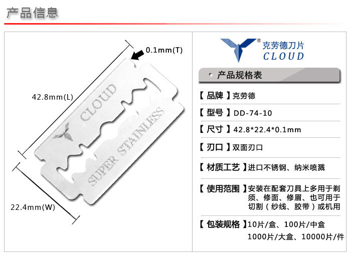外貿(mào)出口、修眉刀廠家配套、化妝師、足浴修腳師專用刀片;廠家直銷,量大價(jià)優(yōu);刀片選用進(jìn)口不銹鋼材質(zhì),納米噴濺,10倍壽命更耐用;多種型號(hào)和包裝自由選擇,支持產(chǎn)品及包裝個(gè)性化定制;可用于修眉、剃須、刮毛、切割等。