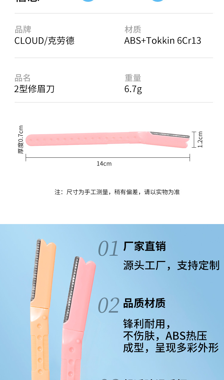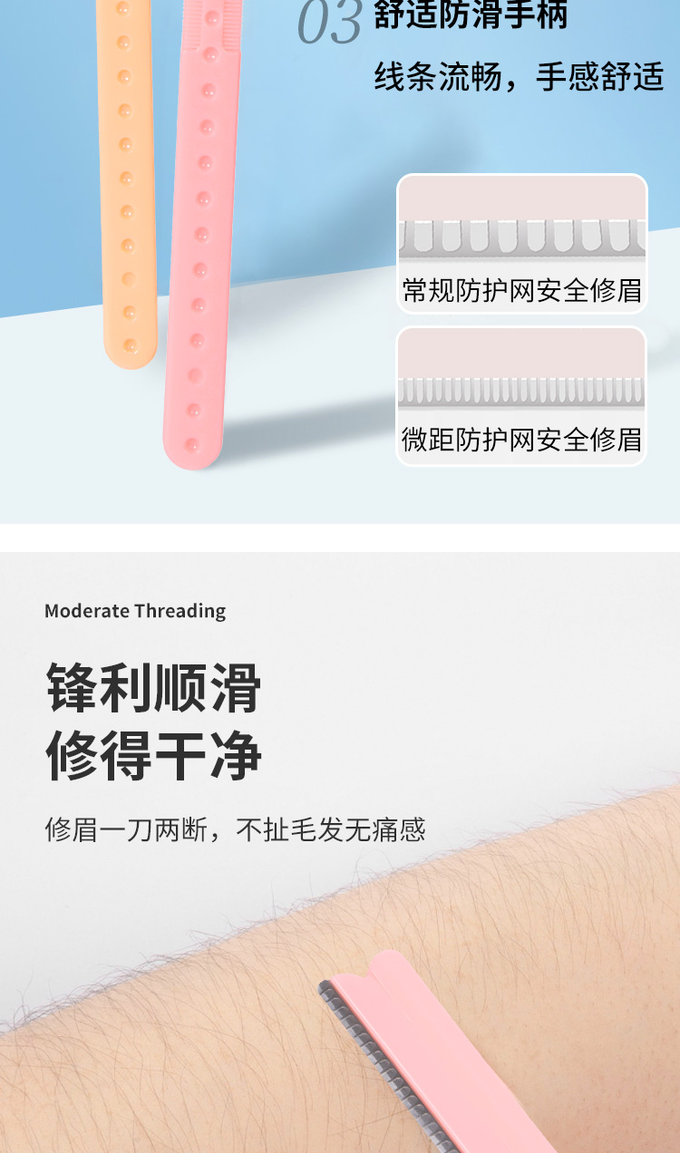 外貿(mào)出口、修眉刀廠家配套、化妝師、足浴修腳師專用刀片;廠家直銷,量大價優(yōu);刀片選用進口不銹鋼材質(zhì),納米噴濺,10倍壽命更耐用;多種型號和包裝自由選擇,支持產(chǎn)品及包裝個性化定制;可用于修眉、剃須、刮毛、切割等。